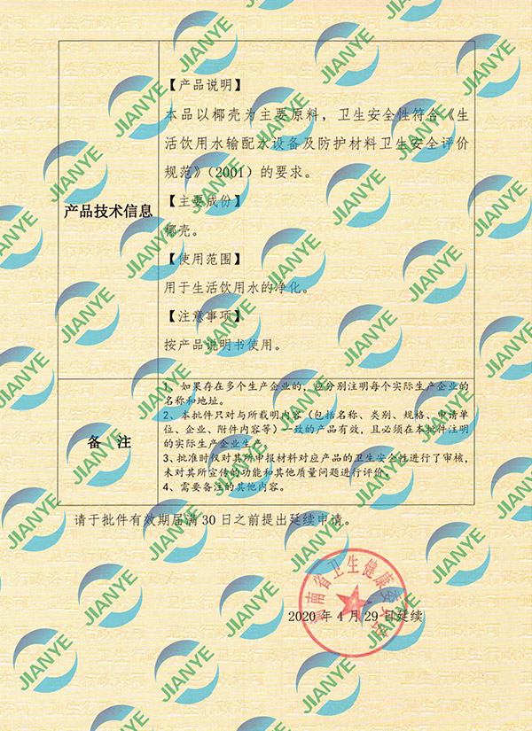 20-24活性炭衛(wèi)生批件【建業(yè)凈水】